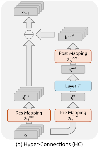 : 表示一个可学习的映射,负责在 个残差流之间混合信息。 :将 的残差流聚合为 维维向量输入到层函数 。 :将层函数 的输出映射回 的残差流。