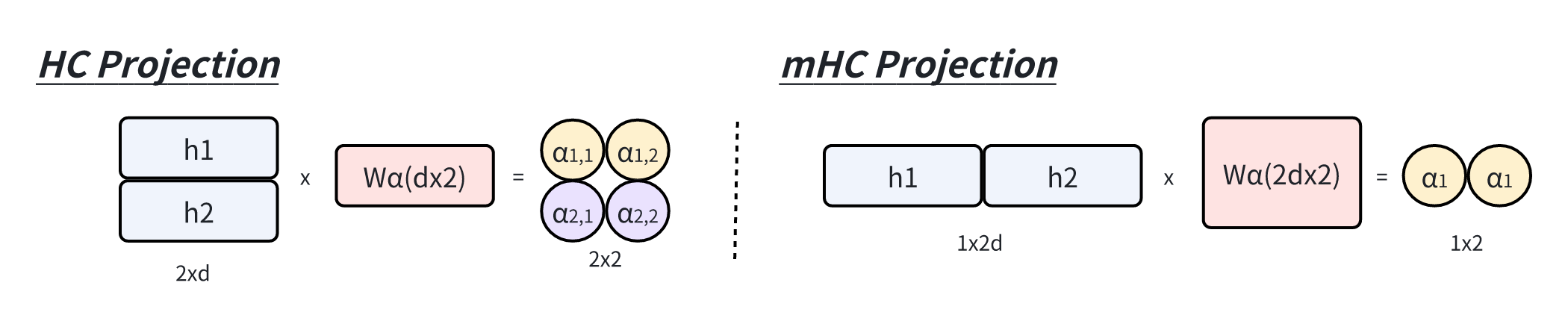 在 HC 公式中,可学习的映射由两部分系数组成:依赖于输入的系数和全局系数,分别称为动态映射和静态映射。形式上,HC 计算系数如下: