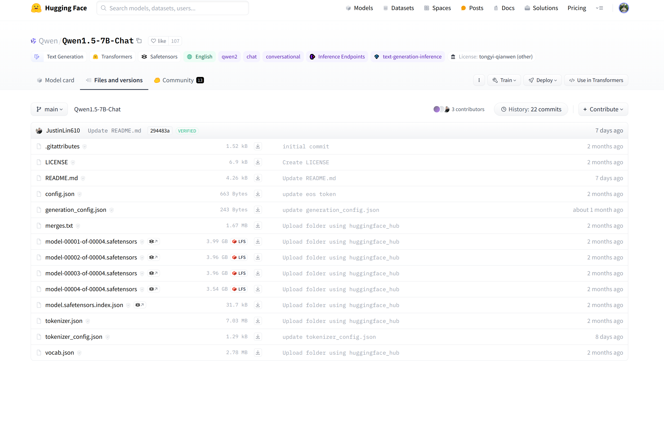 例如QWen1.5-7B-Chat模型,然后将文件夹重命名为qwen1.5_7b_chat,最后放到examples/qwen2/路径下即可,以下文件全部下载: