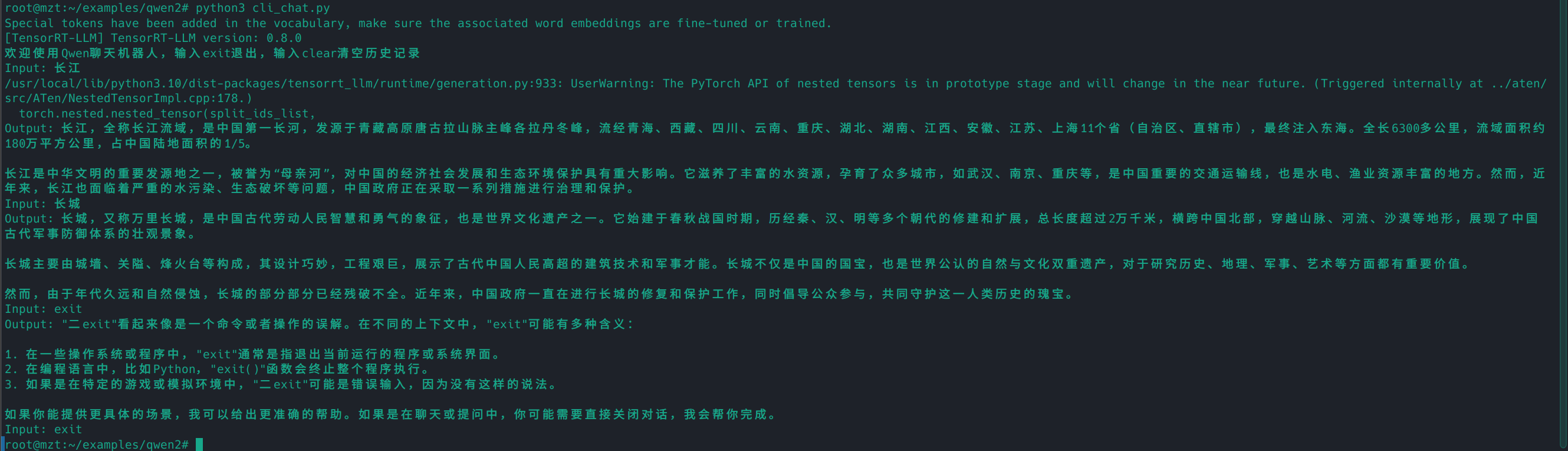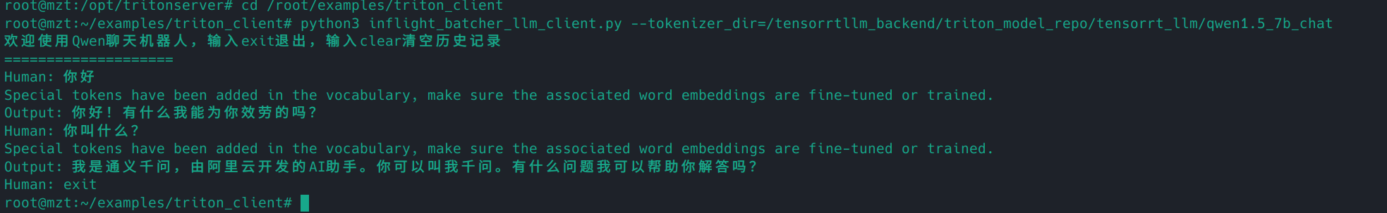 1 2 cd /root/examples/triton_client python3 inflight_batcher_llm_client.py --tokenizer_dir=/tensorrtllm_backend/triton_model_repo/tensorrt_llm/qwen1.5_7b_chat
