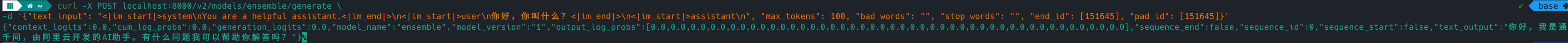1 2 curl -X POST localhost:8000/v2/models/ensemble/generate \ -d '{"text_input": "<|im_start|>system\nYou are a helpful assistant.<|im_end|>\n<|im_start|>user\n你好,你叫什么?<|im_end|>\n<|im_start|>assistant\n", "max_tokens": 100, "bad_words": "", "stop_words": "", "end_id": [151645], "pad_id": [151645]}'