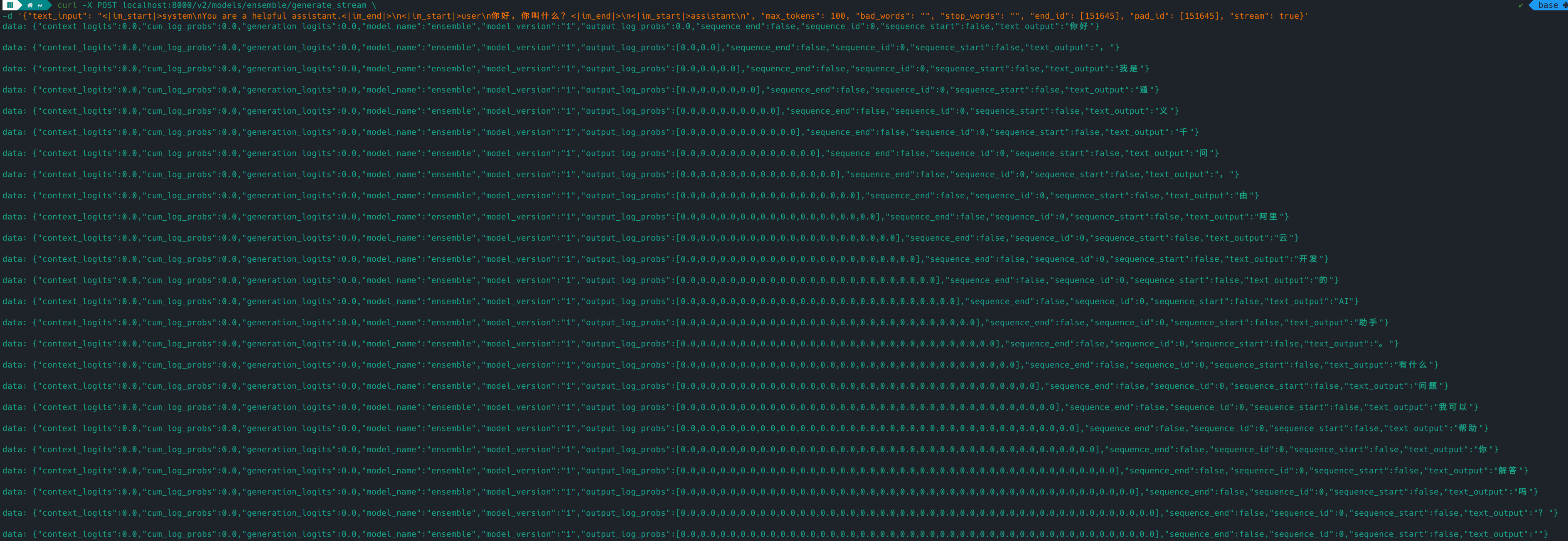 1 2 curl -X POST localhost:8000/v2/models/ensemble/generate_stream \ -d '{"text_input": "<|im_start|>system\nYou are a helpful assistant.<|im_end|>\n<|im_start|>user\n你好,你叫什么?<|im_end|>\n<|im_start|>assistant\n", "max_tokens": 100, "bad_words": "", "stop_words": "", "end_id": [151645], "pad_id": [151645], "stream": true}'