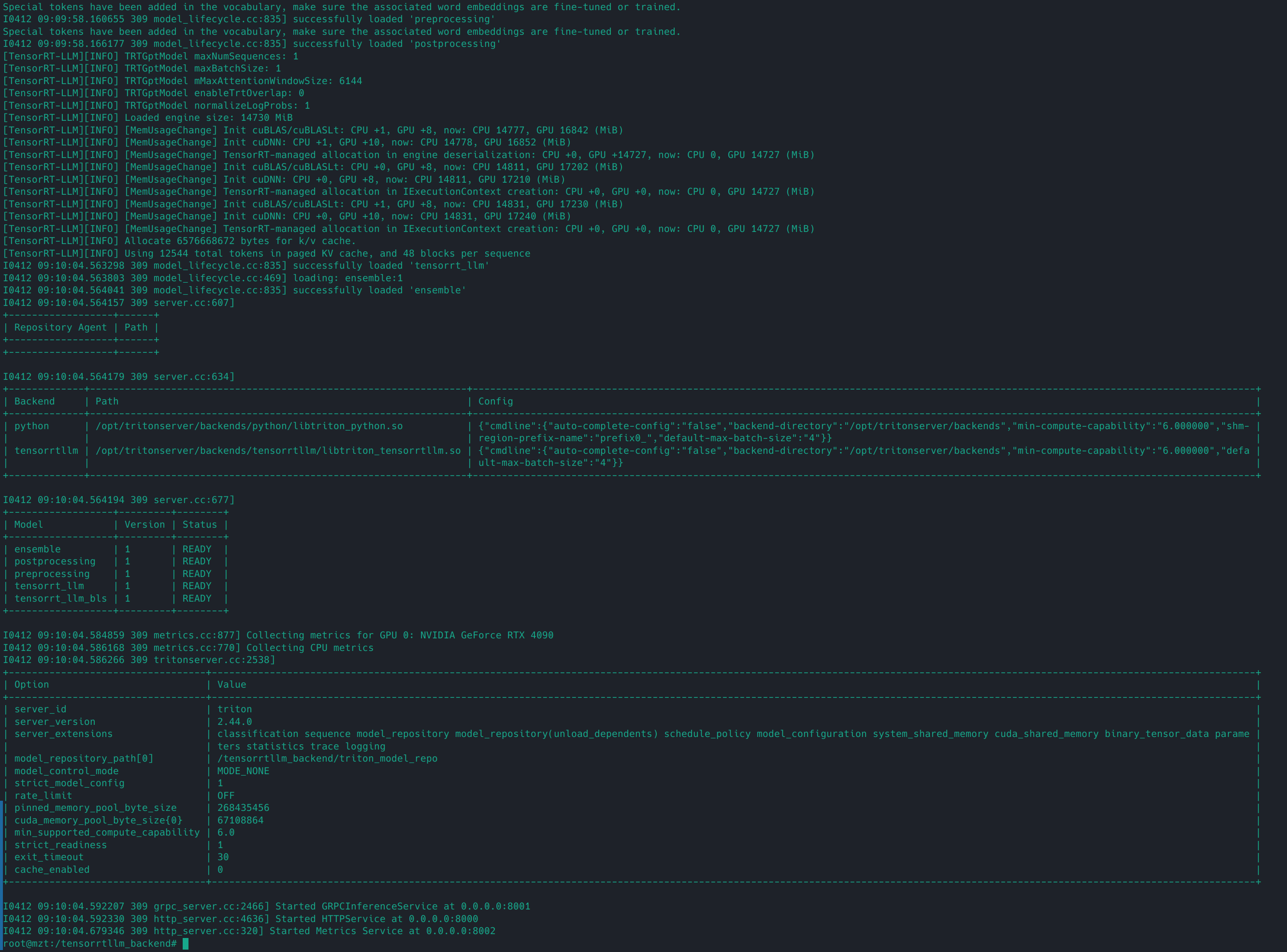 1 2 3 4 5 6 7 8 9 10 11 12 13 14 15 16 17 18 19 cd /tensorrtllm_backend export HF_QWEN_MODEL="/tensorrtllm_backend/triton_model_repo/tensorrt_llm/qwen1.5_7b_chat" export ENGINE_DIR="/tensorrtllm_backend/triton_model_repo/tensorrt_llm/1" export MAX_BATCH_SIZE=2 export TOKENIZE_TYPE=auto# 根据cpu线程数定,一般为batch_size的2倍数或者cpu线程的一半 export INSTANCE_COUNT=4# 我就一张卡,你可以指定用那些卡,用逗号隔开 export GPU_DEVICE_IDS=0 python3 tools/fill_template.py -i triton_model_repo/preprocessing/config.pbtxt tokenizer_dir:${HF_QWEN_MODEL},tokenizer_type:${TOKENIZE_TYPE},triton_max_batch_size:${MAX_BATCH_SIZE},preprocessing_instance_count:${INSTANCE_COUNT} python3 tools/fill_template.py -i triton_model_repo/postprocessing/config.pbtxt tokenizer_dir:${HF_QWEN_MODEL},tokenizer_type:${TOKENIZE_TYPE},triton_max_batch_size:${MAX_BATCH_SIZE},postprocessing_instance_count:${INSTANCE_COUNT} python3 tools/fill_template.py -i triton_model_repo/tensorrt_llm_bls/config.pbtxt triton_max_batch_size:${MAX_BATCH_SIZE},decoupled_mode:False,bls_instance_count:${INSTANCE_COUNT},accumulate_tokens:True python3 tools/fill_template.py -i triton_model_repo/ensemble/config.pbtxt triton_max_batch_size:${MAX_BATCH_SIZE} python3 tools/fill_template.py -i triton_model_repo/tensorrt_llm/config.pbtxt triton_max_batch_size:${MAX_BATCH_SIZE},decoupled_mode:True,max_beam_width:1,engine_dir:${ENGINE_DIR},exclude_input_in_output:True,enable_kv_cache_reuse:False,batching_strategy:inflight_batching,max_queue_delay_microseconds:600,gpu_device_ids:${GPU_DEVICE_IDS}