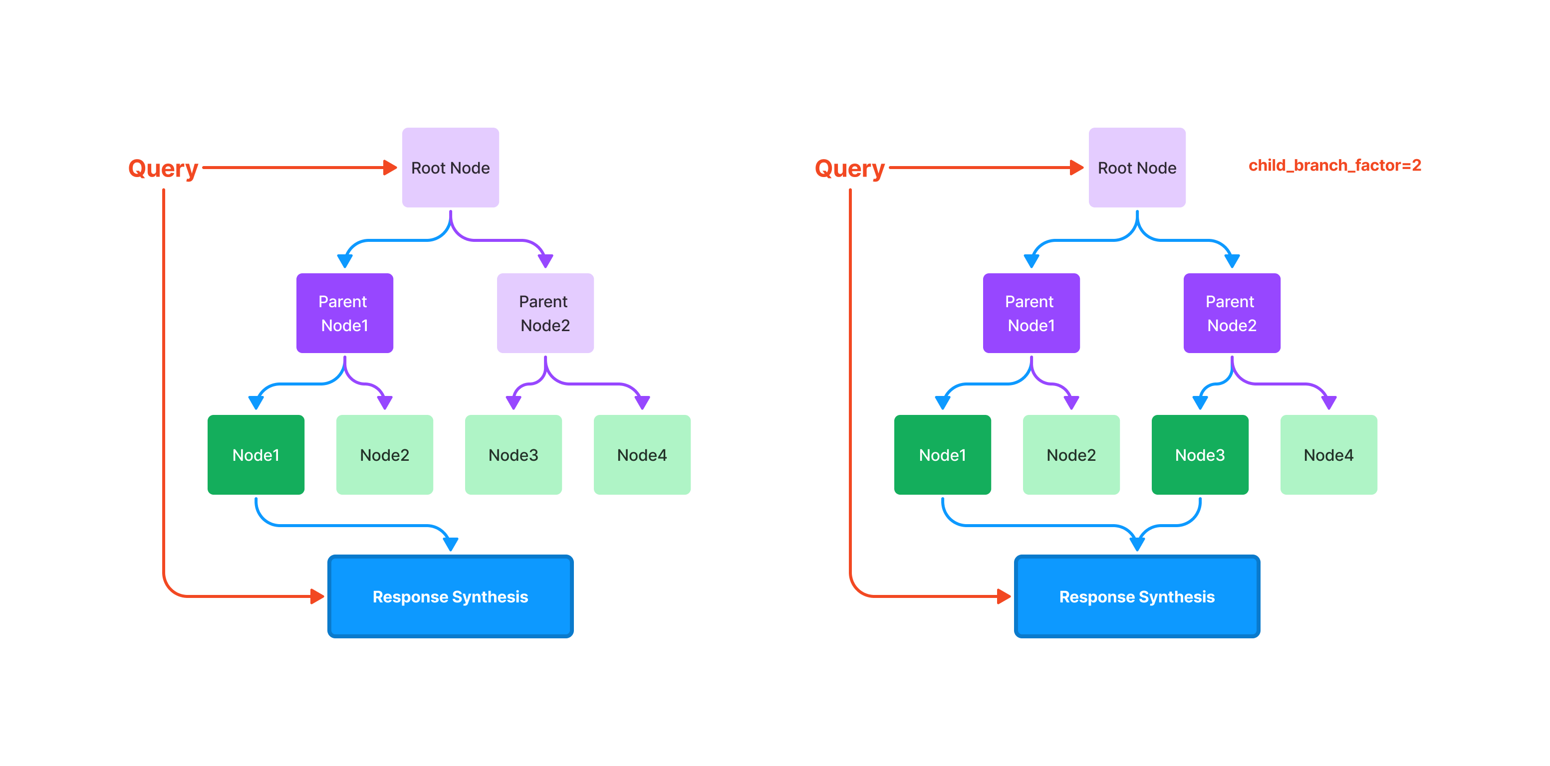 查询树索引涉及从根节点遍历到叶节点。默认情况下,(child_branch_factor=1),一个查询给定一个父节点选择一个子节点。如果