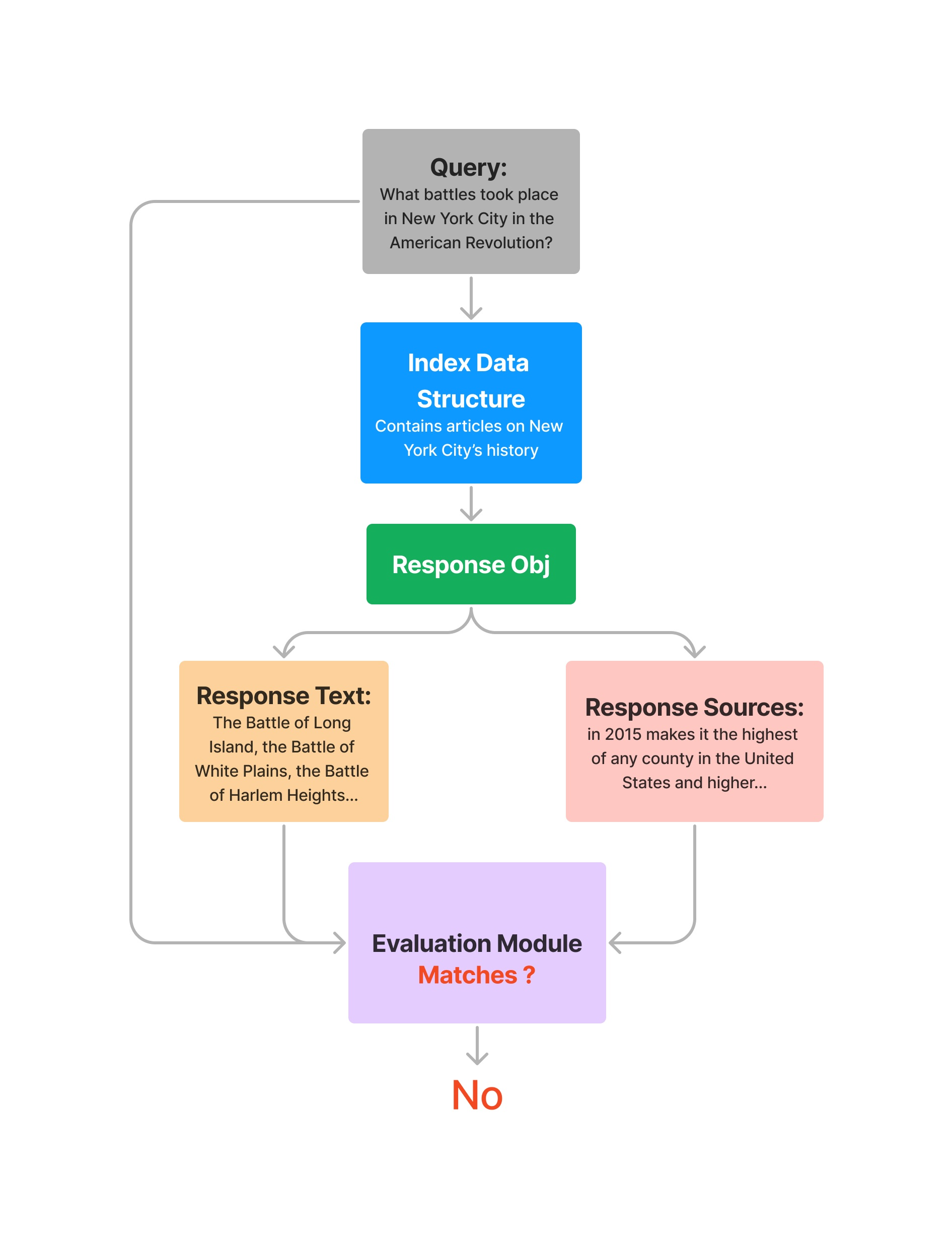 # query index query_engine = vector_index.as_query_engine() query = "What battles took place in New York City in the American Revolution?" response = query_engine.query(query) response_str = response.response for source_node in response.source_nodes: eval_result = evaluator.evaluate( query=query, response=response_str, contexts=[source_node.get_content()], ) print(str(eval_result.passing))