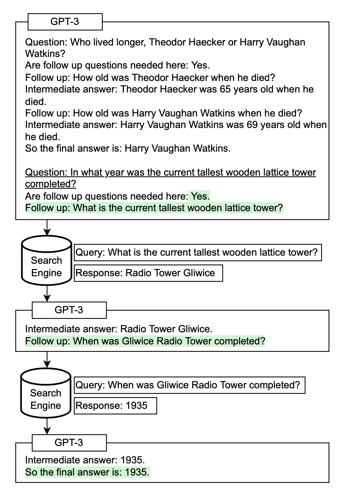 Follow-up Question(追问)加Intermediate Answer(中间答案)的技巧,来辅助大模型寻找事实性问题的过渡性答