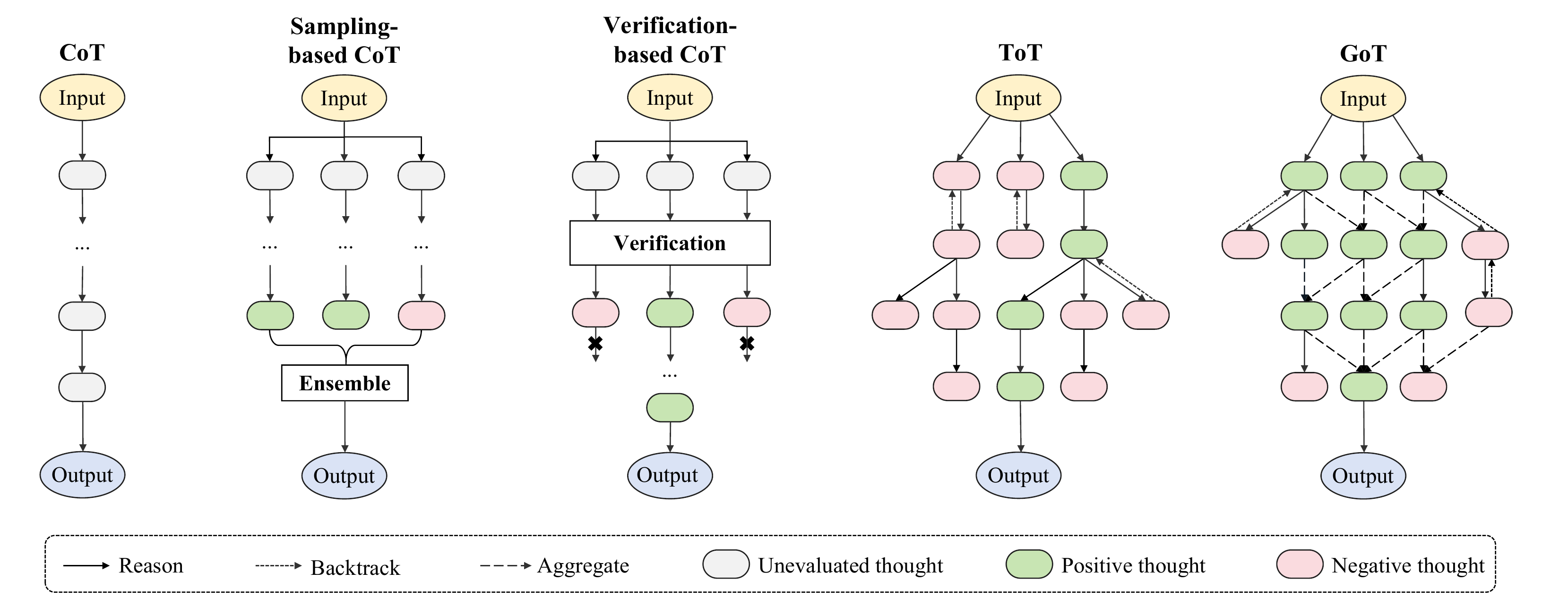 - 逐步推理(Step-by-step Reasoning):大语言模型则可以利用思维链(Chain-of-Thought, CoT)提示策略 来加强推理性能。具体来说,大语言模型可以在提示中引入任务相关的中间推理步骤来加强复杂任务的求解,从而获得更为可靠的答案。思维链提示特别适合帮助大语言模型解决复杂数学问题,而具有思维链能力也是大语言模型能力的重要体现。