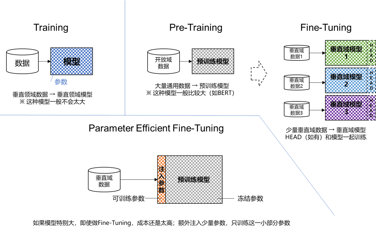 - 训练阶段:在训练阶段,模型使用特定任务的有标签数据集进行训练,目标是根据该任务的特定目标函数调整模型参数,使其在该任务上表现良好。