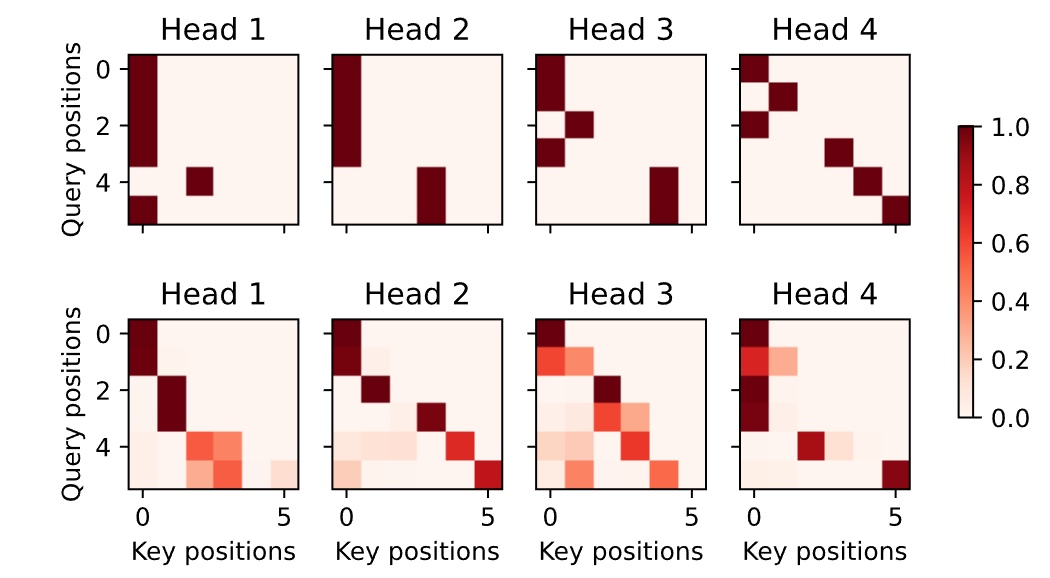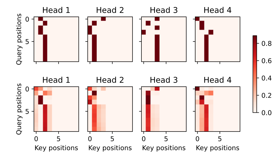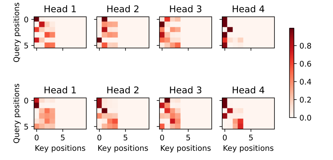 1 2 3 4 d2l.show_heatmaps( dec_inter_attention_weights, xlabel='Key positions' , ylabel='Query positions' , titles=['Head %d' % i for i in range (1 , 5 )], figsize=(7 , 3.5 ))
