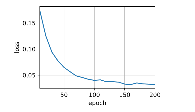 1 2 3 4 5 6 7 8 9 10 11 12 13 14 15 16 17 18 num_hiddens, num_layers, dropout, batch_size, num_steps = 32 , 2 , 0.1 , 64 , 10 lr, num_epochs, device = 0.005 , 200 , try_gpu() ffn_num_input, ffn_num_hiddens, num_heads = 32 , 64 , 4 key_size, query_size, value_size = 32 , 32 , 32 norm_shape = [32 ] train_iter, src_vocab, tgt_vocab = load_data_nmt(batch_size, num_steps) encoder = TransformerEncoder( len (src_vocab), key_size, query_size, value_size, num_hiddens, norm_shape, ffn_num_input, ffn_num_hiddens, num_heads, num_layers, dropout) decoder = TransformerDecoder( len (tgt_vocab), key_size, query_size, value_size, num_hiddens, norm_shape, ffn_num_input, ffn_num_hiddens, num_heads, num_layers, dropout) net = EncoderDecoder(encoder, decoder) train_seq2seq(net, train_iter, lr, num_epochs, tgt_vocab, device)