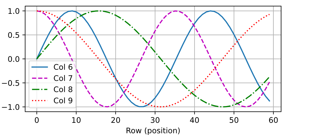 1 2 3 4 5 6 7 encoding_dim, num_steps = 32 , 60 pos_encoding = PositionalEncoding(encoding_dim, 0 ) pos_encoding.eval () X = pos_encoding(torch.zeros((1 , num_steps, encoding_dim))) P = pos_encoding.P[:, :X.shape[1 ], :] d2l.plot(torch.arange(num_steps), P[0 , :, 6 :10 ].T, xlabel='Row (position)' , figsize=(6 , 2.5 ), legend=["Col %d" % d for d in torch.arange(6 , 10 )])