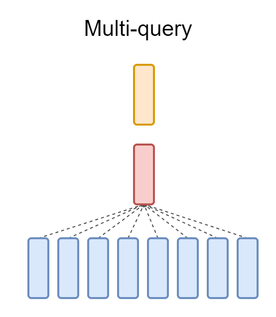 | class MultiQueryAttention(Attention): r""" https://arxiv.org/pdf/1911.02150.pdf """ def __init__(self, word_size: int = 512, embed_dim: int = 64, n_query:int=8) -> None: super().__init__(word_size, embed_dim) self.n_query = n_query self.proj = nn.Parameter(torch.empty(embed_dim * n_query, embed_dim)) nn.init.xavier_normal_(self.proj) delattr(self, 'query') self.querys = nn.ModuleList([ nn.Linear(in_features=word_size, out_features=embed_dim, bias=True) for _ in range(n_query) ]) self.key = nn.Linear(in_features=word_size, out_features=embed_dim, bias=True) self.value = nn.Linear(in_features=word_size, out_features=embed_dim, bias=True)