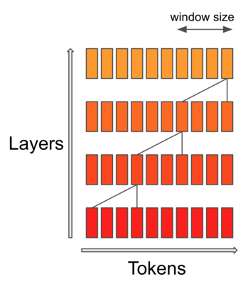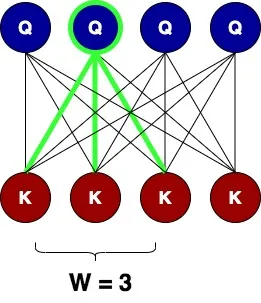 这个关注窗口会让查询节点丢失来自该窗口之外的关键节点的信息?将多个层堆叠在一起时,最终会发生的情况是,在较高层上,查询节点从远邻居那里获得注意力信息,但以不同的表示方式。就像卷积层对图像的作用一样!下图提供了窗口大小为