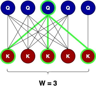 3 的注意力窗口,其中以绿色突出显示的节点 Q