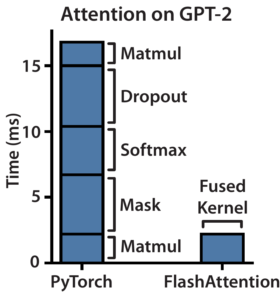 可以看到,masking,softmax 和 dropout 操作占用了大量时间,而主要利用 FLOPS 的矩阵乘法(Matmul)却只占用了一部分时间。HBM读写次数多,减慢了运行时间(wall-clock time)。