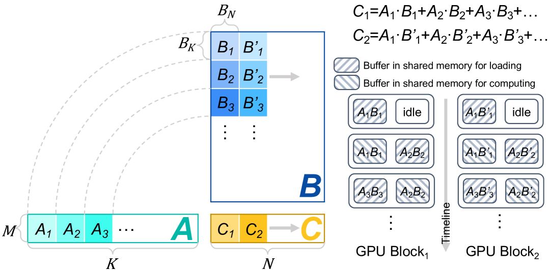 buffering技术。具体来说就是在共享内存中分配两个buffer,一个buffer用于执行当前tile的GEMM计算,同时另一个buffer则加载下一个tile