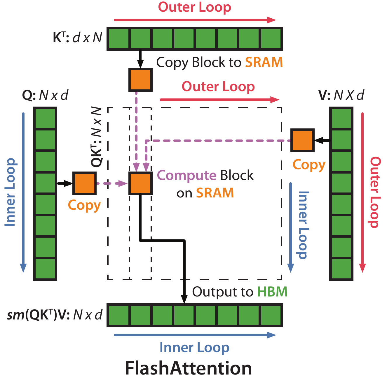 可以看到 FlashAttention 将多个操作融合在一起,其只从 HBM 加载一次,执行融合的算子操作,然后将结果写回 HBM。融合操作主要采用了如下两种技术: