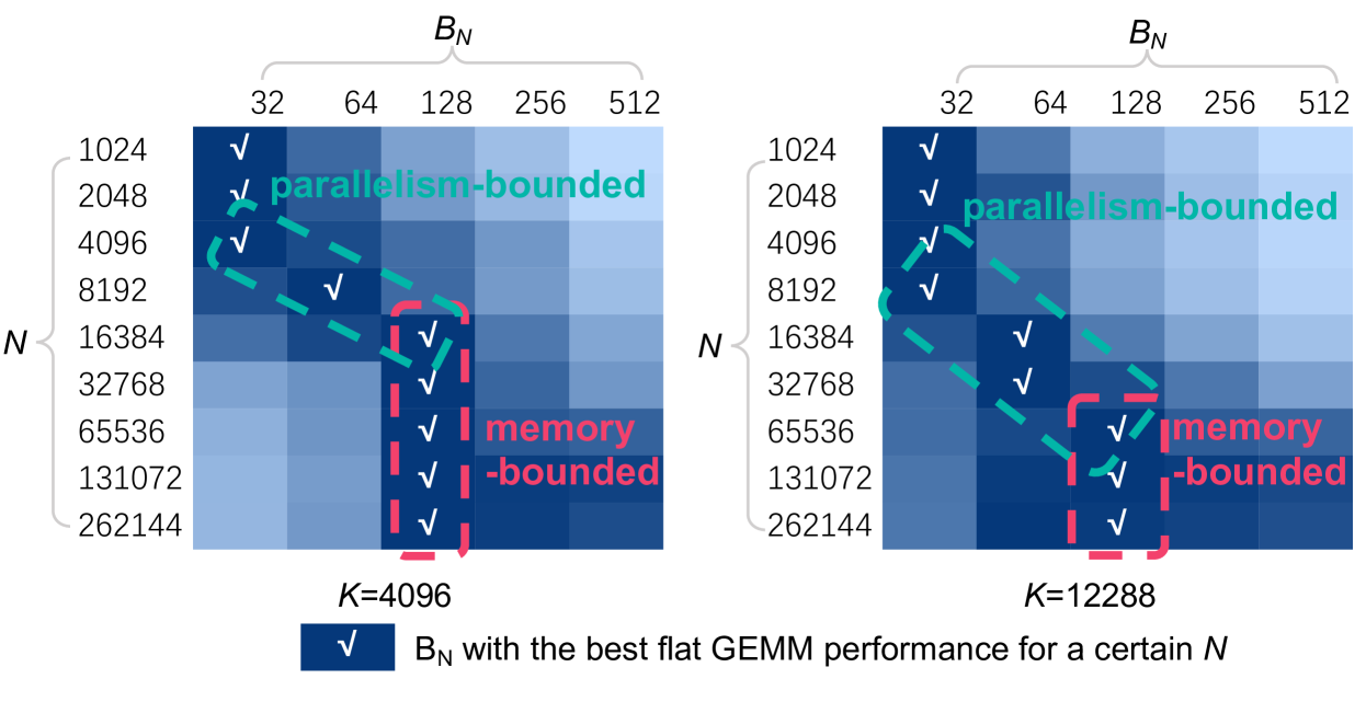 token,flat GEMM 操作趋向于扁平形状(当批量大小为 1 时甚至会变成