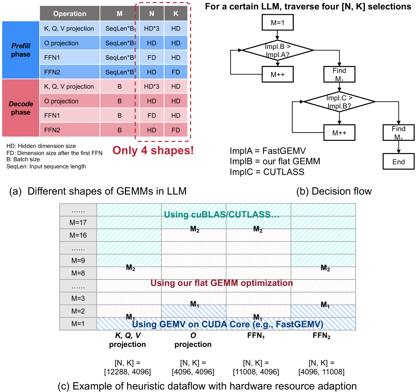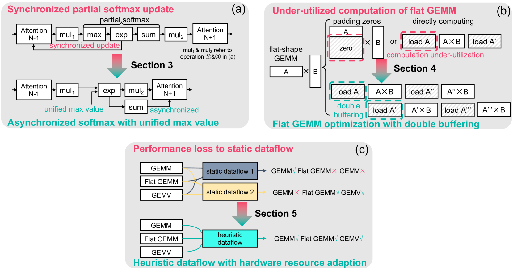 - Heuristic dataflow with hardware resource adaption.FlashDecoding++ 同时考虑输入动态和硬件配置,并为 LLM 推理数据流动态应用内核优化。