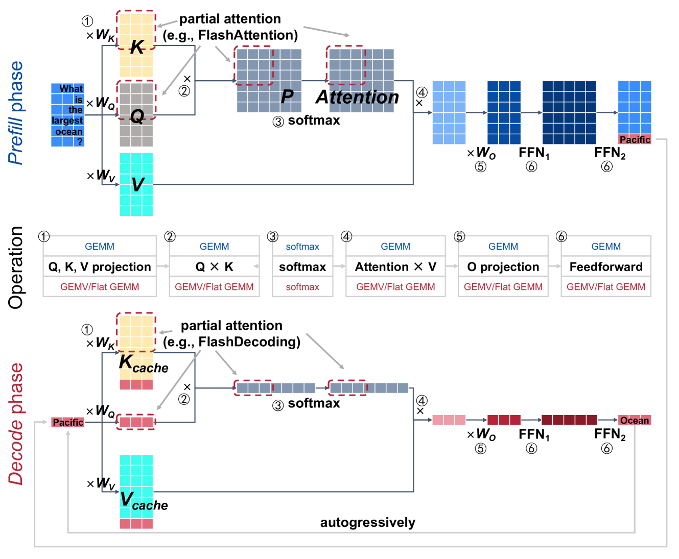 LLM推理中的主要操作如下图所示:linear projection(①和⑤)、attention(②、③和④)和feedforward network(⑥)。为简单起见,这里忽略了position embedding、non-linear activation、mask等操作。将LLM推理时对Prompt的处理过程称为预填充阶段(Prefill phase),第二阶段预测过程称为解码阶段(Decode phase)。这两个阶段的算子基本一致,主要是输入数据的shape是不同的。由于解码阶段一次只处理一个令牌(batch size=1,或batch size很小),因此输入矩阵是flat-shape matrices(甚至是vectors),参见下图解码阶段部分中和KV Cache拼接的红色向量。