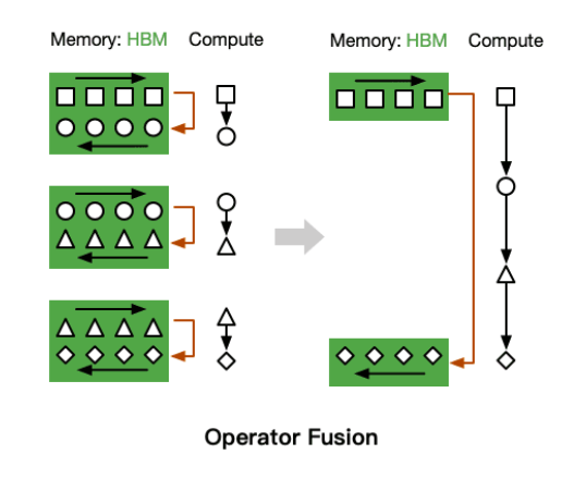 - 对于性能受限于内存带宽的操作,进行加速的常用方式就是kernel融合。kernel融合的基本思想是:避免反复执行“从HBM中读取输入数据,执行计算,将计算结果写入到HBM中”,将多个操作融合成一个操作,减少读写HBM的次数。