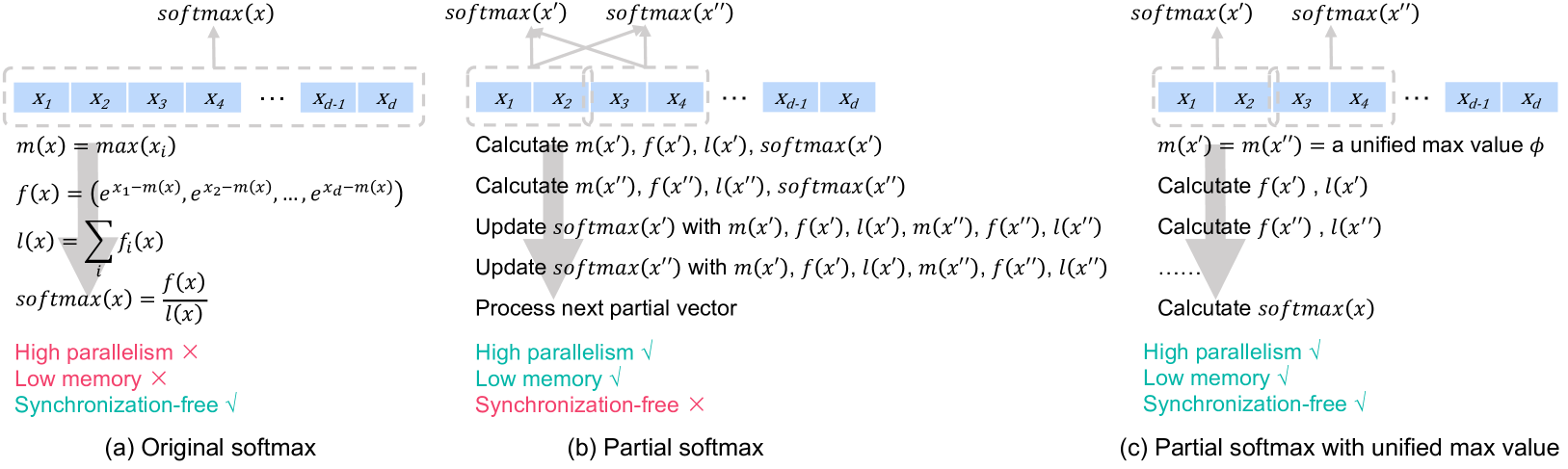 不同 softmax 计算方案的比较。 (a) 整个向量的 Softmax 计算。 (b)计算每个部分向量的部分softmax,并且所有部分softmax结果需要同步更新操作。 (c)使用统一的最大值计算部分softmax,并且每个部分向量单独处理,没有同步更新。