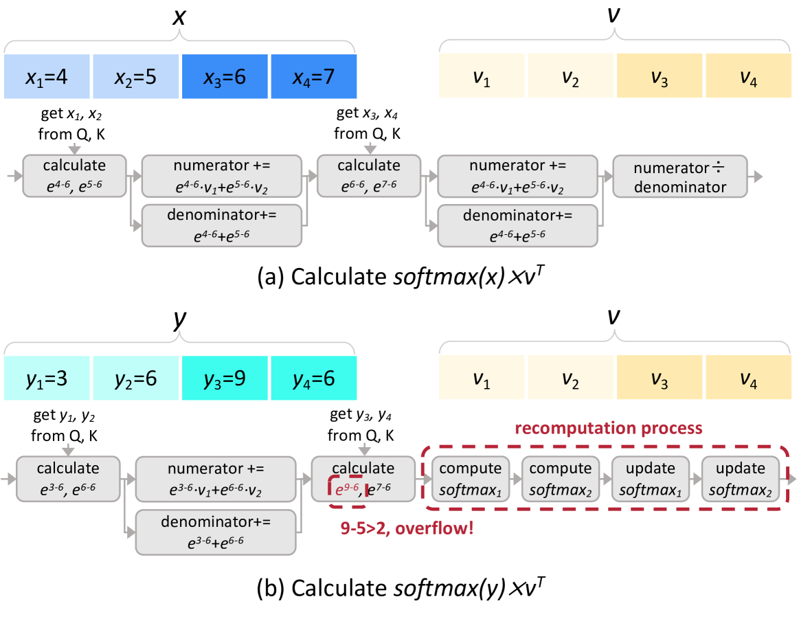 异步partial softmax 计算示例。 (a) 每个partial softmax 结果都是单独处理的,没有同步更新。 (b) 当发生溢出时,需要对所有 parital softmax 计算进行重新计算过程。