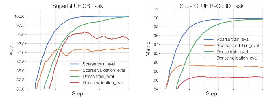 从图中可以看出,在小型任务(左图)中,稀疏模型在验证集上明显过拟合。而在大型任务(右图)中,MoE 的表现却相当不错。