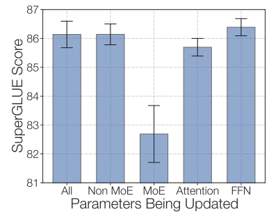 另一个尝试是冻结所有非专家层的权重,结果如预期那样导致了性能大幅下降,因为 MoE 层占据了网络的大部分。相反,仅冻结 MoE 层的参数几乎能达到更新所有参数的效果。这种方法可以加速微调过程,同时减少内存使用。