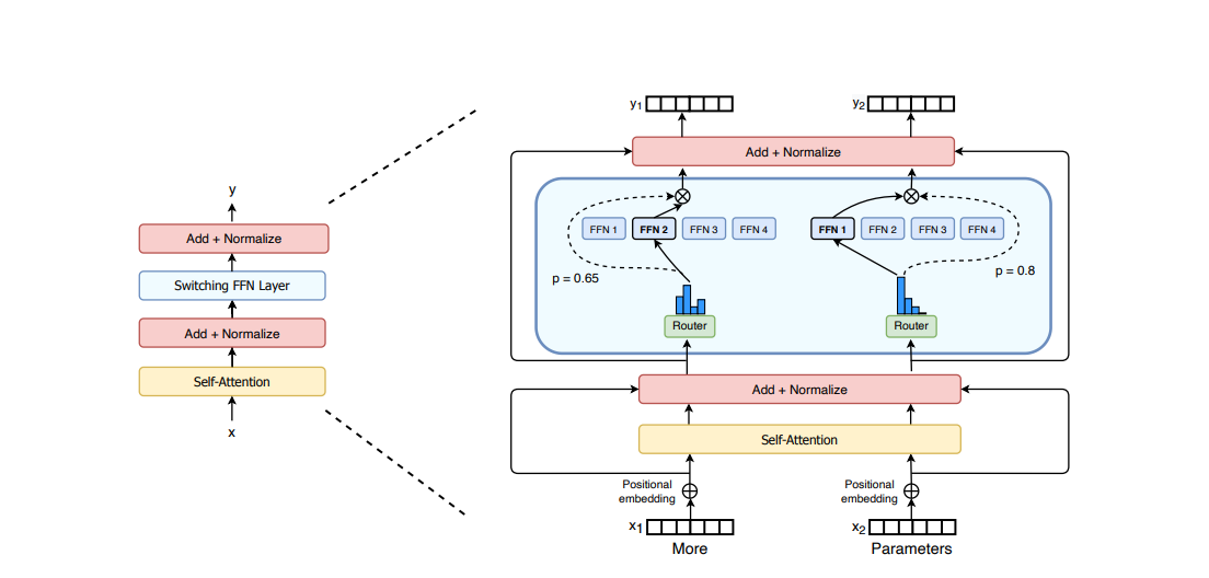 上图中每个专家处理由容量因子(capacity factor)调制的固定批量大小的Tokens。每个Token被路由到具有最高路由器概率的专家,但每个专家的批量大小固定为(total_tokens / num_experts) × capacity_factor。如果Tokens分配不均,则某些专家将溢出(用红色虚线表示),导致这些Tokens不被该层处理。更大的容量因子可以缓解此溢出问题,但也会增加计算和通信成本(用填充的白色/空槽表示)。