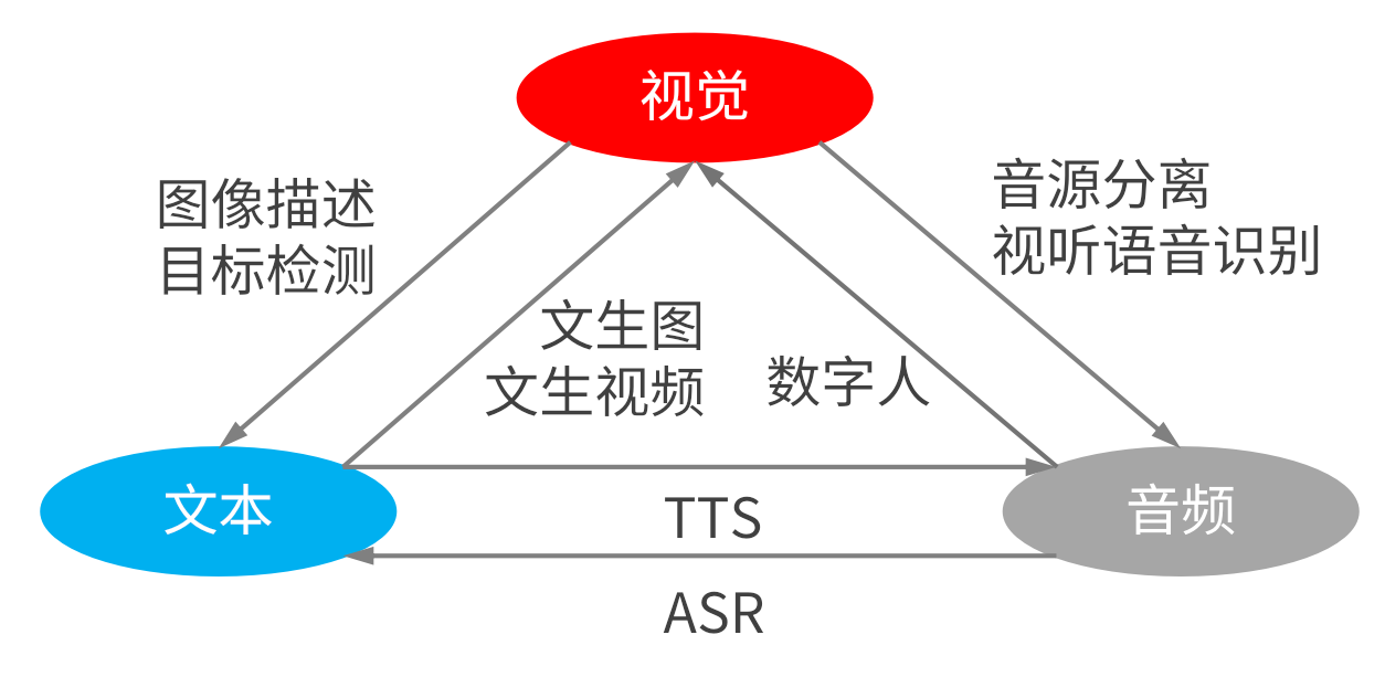 跨模态是指模型输入和输出为不同模态,如文生图,文生视频,文转语音,语音转文字等等,如上图。