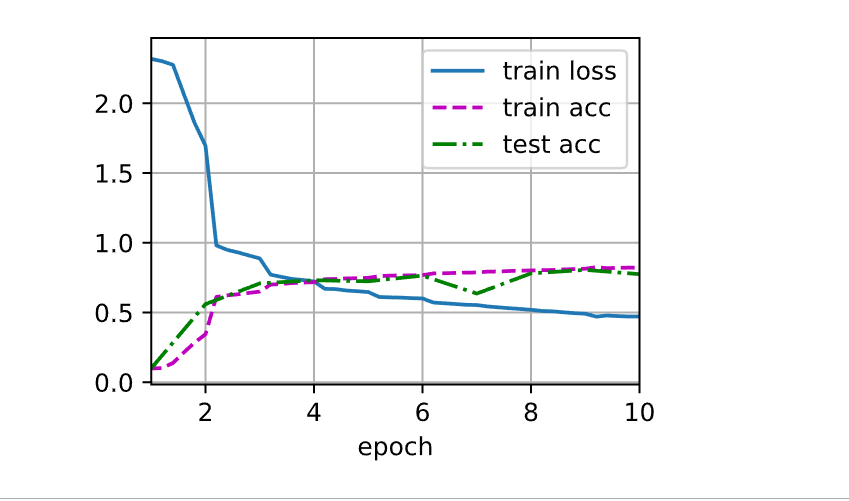 1 2 3 4 5 6 7 8 9 10 11 12 13 14 15 16 17 18 19 20 21 22 23 24 25 26 27 28 29 30 31 32 33 34 35 36 37 38 39 40 41 42 43 44 45 46 47 48 def train6 (net, train_iter, test_iter, num_epochs, lr, device ): """用GPU训练模型""" def init_weights (m ): if type (m) == nn.Linear or type (m) == nn.Conv2d: nn.init.xavier_uniform_(m.weight) net.apply(init_weights) print ('training on' , device) net.to(device) optimizer = torch.optim.SGD(net.parameters(), lr=lr) loss = nn.CrossEntropyLoss() animator = d2l.Animator(xlabel='epoch' , xlim=[1 , num_epochs], legend=['train loss' , 'train acc' , 'test acc' ]) timer, num_batches = d2l.Timer(), len (train_iter) for epoch in range (num_epochs): metric = d2l.Accumulator(3 ) net.train() for i, (X, y) in enumerate (train_iter): timer.start() optimizer.zero_grad() X, y = X.to(device), y.to(device) y_hat = net(X) l = loss(y_hat, y) l.backward() optimizer.step() with torch.no_grad(): metric.add(l * X.shape[0 ], d2l.accuracy(y_hat, y), X.shape[0 ]) timer.stop() train_l = metric[0 ] / metric[2 ] train_acc = metric[1 ] / metric[2 ] if (i + 1 ) % (num_batches // 5 ) == 0 or i == num_batches - 1 : animator.add(epoch + (i + 1 ) / num_batches, (train_l, train_acc, None )) test_acc = evaluate_accuracy_gpu(net, test_iter) animator.add(epoch + 1 , (None , None , test_acc)) print (f'loss {train_l:.3 f} , train acc {train_acc:.3 f} , ' f'test acc {test_acc:.3 f} ' ) print (f'{metric[2 ] * num_epochs / timer.sum ():.1 f} examples/sec ' f'on {str (device)} ' )def try_gpu (i=0 ): """如果存在,则返回gpu(i),否则返回cpu()""" if torch.cuda.device_count() >= i + 1 : return torch.device(f'cuda:{i} ' ) return torch.device('cpu' ) lr, num_epochs = 0.9 , 10 train6(net, train_iter, test_iter, num_epochs, lr, try_gpu())