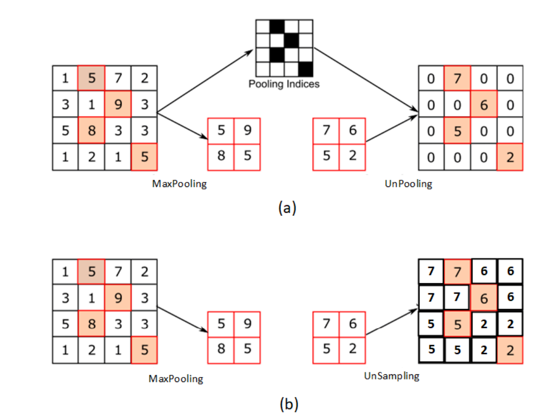 pooling位置记录最大值的索引位置,然后在unpooling阶段时将对应的值放置到原先最大值位置,其余位置补0;