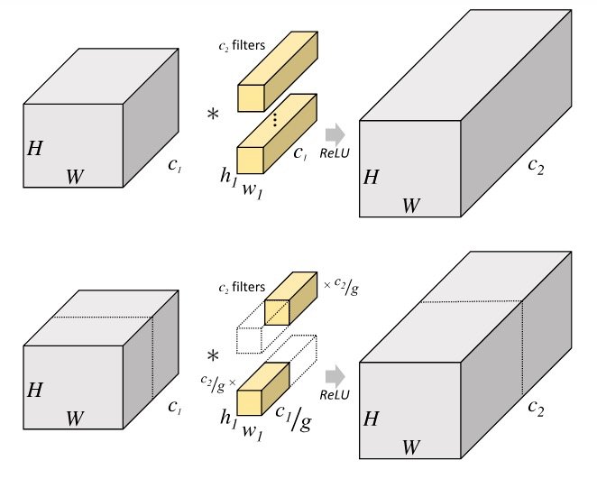 和普通卷积相比,分组卷积将输入通道分成g组,卷积核也分成对应的g组,每个卷积核只在其对应的那组输入通道上做卷积,最后将g组结果堆叠拼接。由于每个卷积核只需要在全部输入通道的 个通道上做卷积,参数量降低为普通卷积的 。分组卷积要求输入通道和输出通道数都是g的整数倍。参考文章:https://zhuanlan.zhihu.com/p/65377955