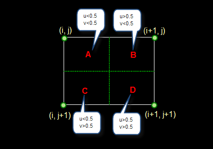 表示在 下方一个方格点, 表示在 上方的一个方格点,对于 、 、 、 是同样的意思。 、 、 表示 、 、 在较小相关坐标的差值.