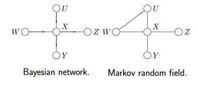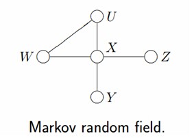 - 但在有些情况下,强制对某些结点之间的边增加方向是不合适的。使用没有方向的无向边,形成了无向图模型(Undirected Graphical Model,UGM), 又被称为马尔科夫随机场或者马尔科夫网络(Markov Random Field, MRF or Markov network)。