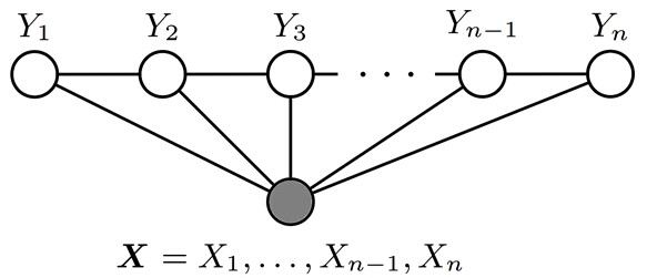 - 设 X = (X1, X2, ⋯, Xn) 和 Y = (Y1, Y2, ⋯, Ym) 都是联合随机变量,若随机变量Y构成一个无向图 G = (V, E) 表示的马尔科夫随机场(MRF),则条件概率分布P(Y|X)称为条件随机场(Conditional Random Field, 简称CRF)。如下图所示,便是一个线性链条件随机场的无向图模型: