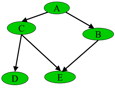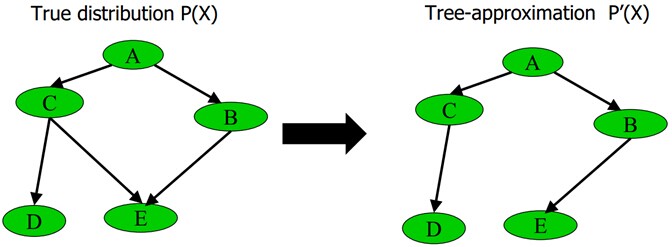 删除贝叶斯网络中的若干条边,使得它不含有无向环.比如给定下图中左边部分所示的原贝叶斯网络,可以通过去掉C和E之间的边,使得它重新变成有向无环图,从而成为图中右边部分的近似树结构: