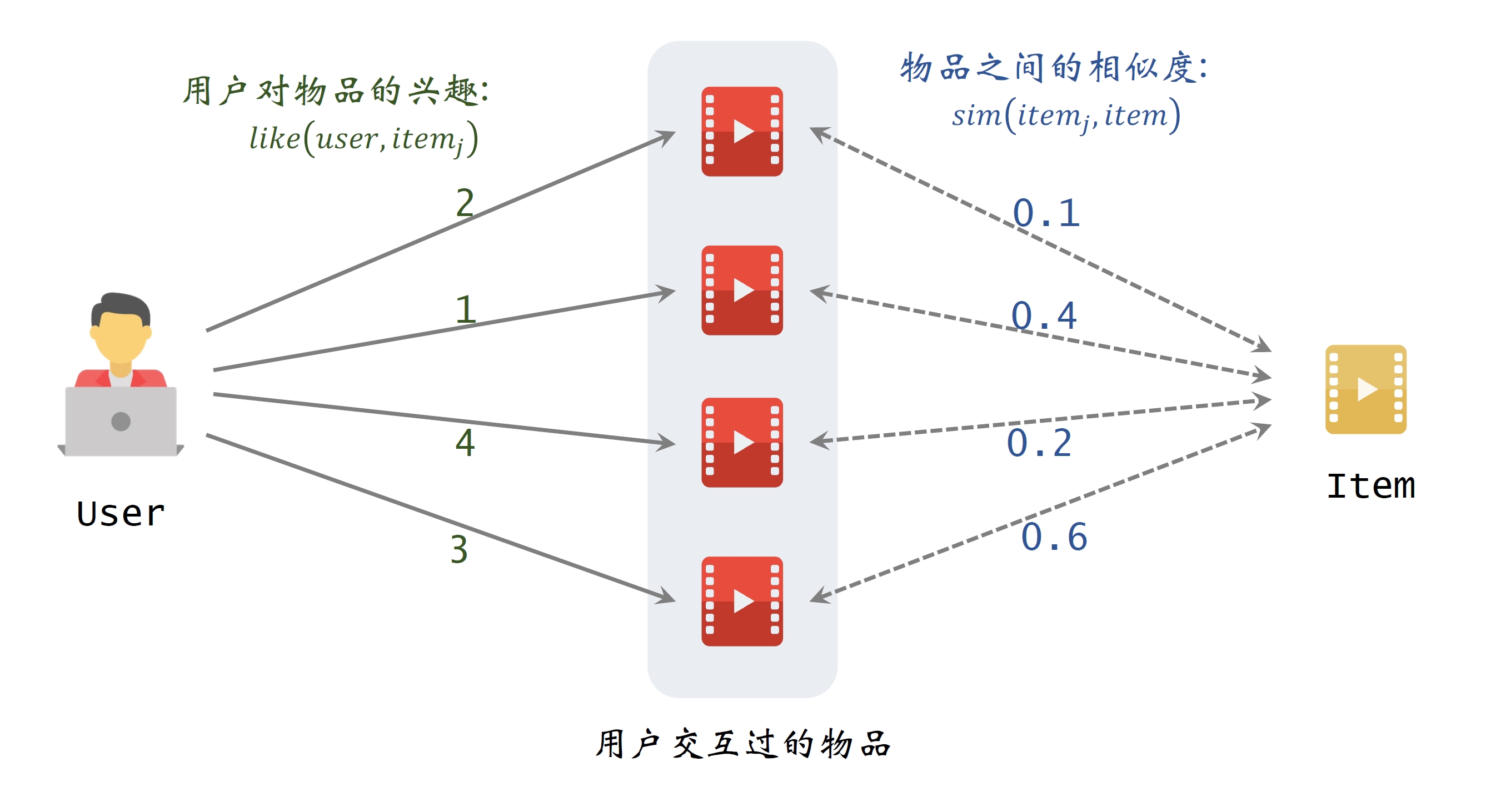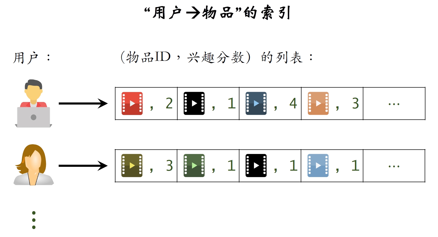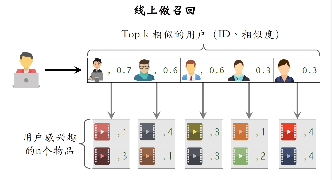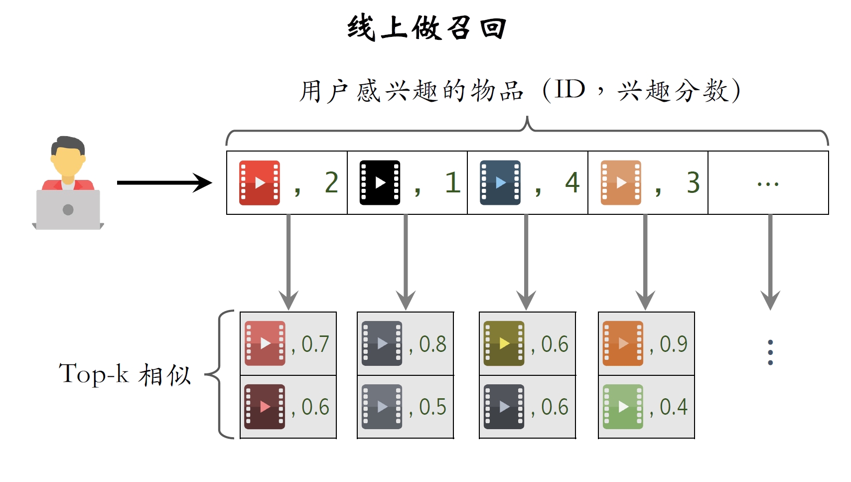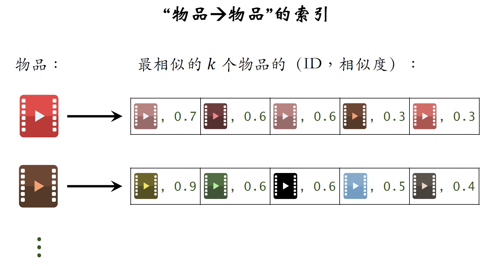 物品”索引,找到⽤户近期感兴趣的物品列表(last-n)。 - 对于last-n列表中每个物品,通过“物品
