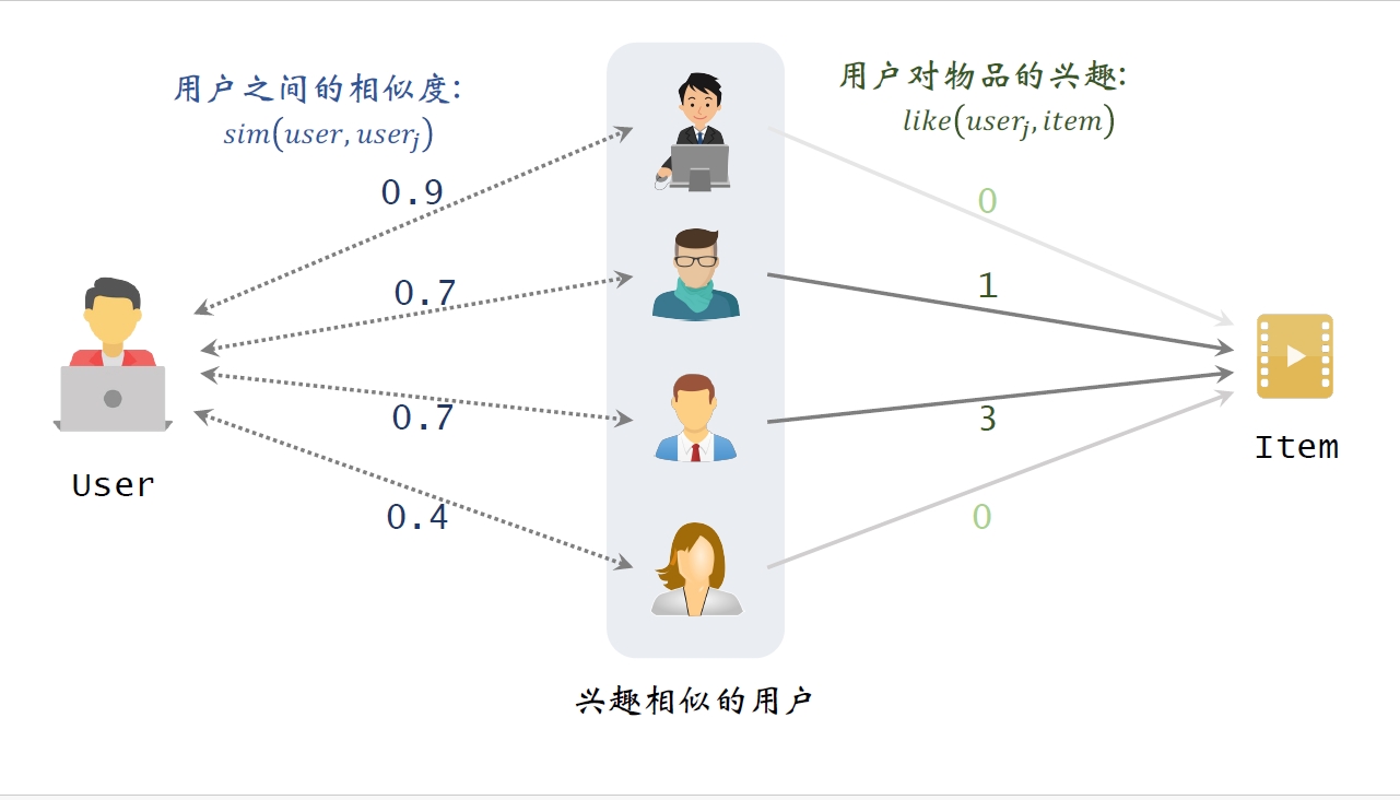 - 给目标用户推荐相似用户有兴趣但是目标用户还没看过的物品。