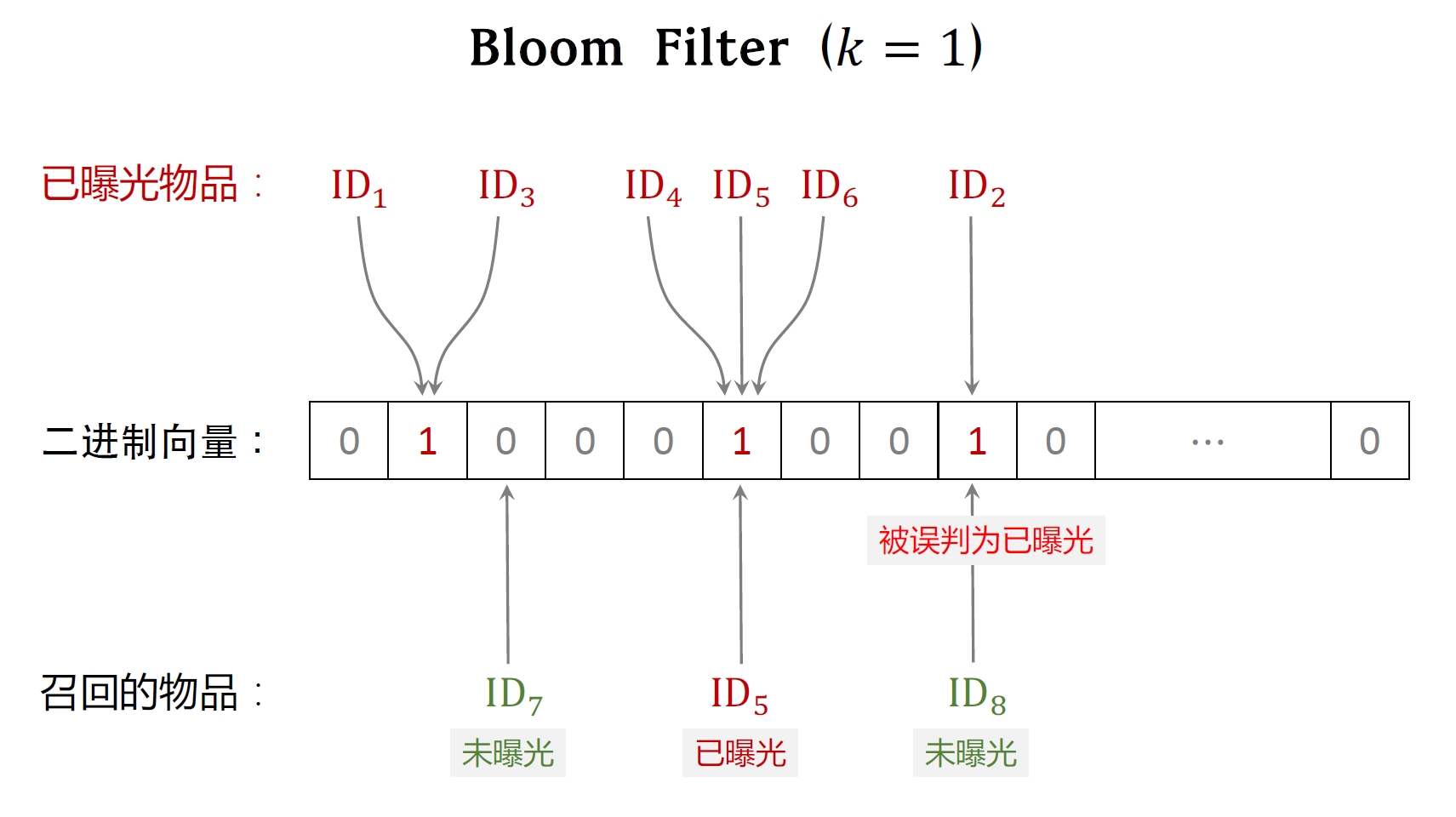 如果判断为yes,那么该物品很可能在集合中。(可能误伤,错误判断未曝光物品为已曝光,将其过滤掉。)
