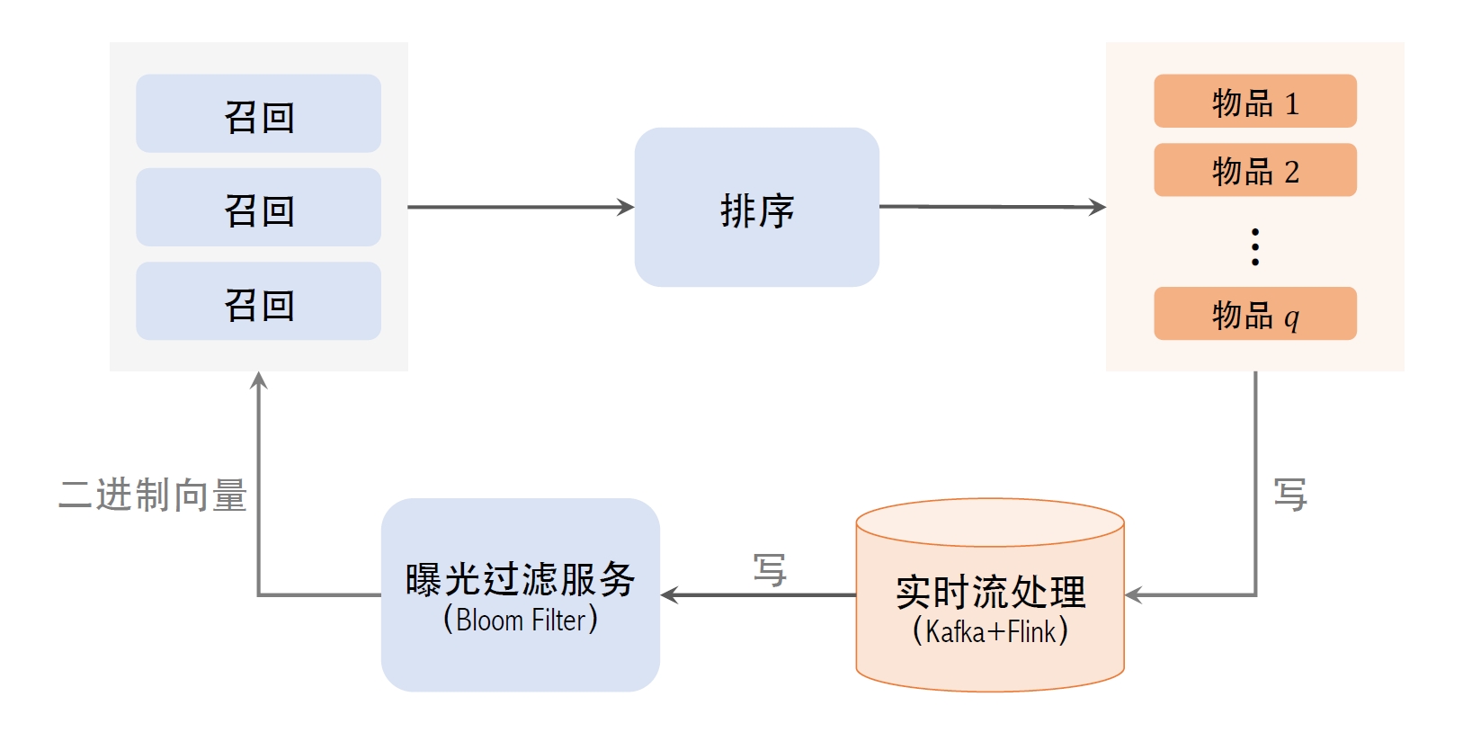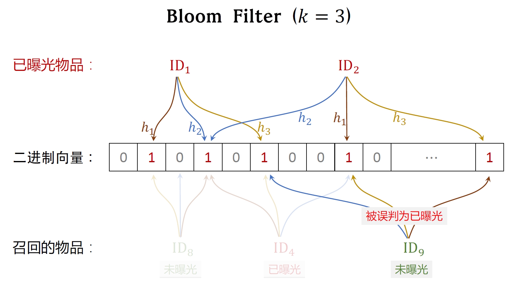 - Bloom filter 判断⼀个物品ID是否在已曝光的物品集合中。