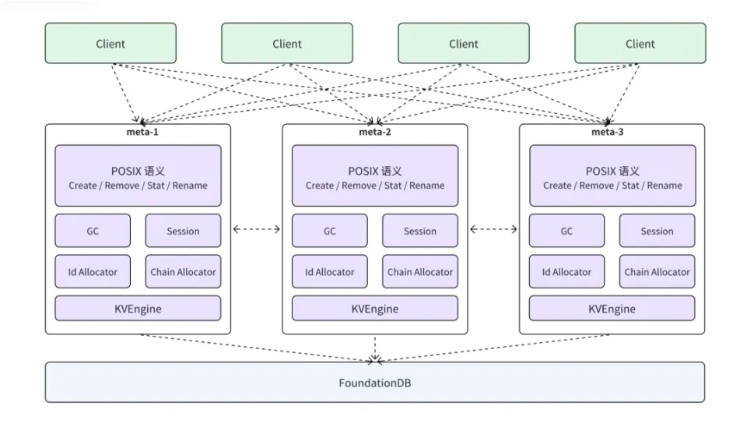 - 元数据服务:这个组件负责管理文件系统的元数据,例如文件和目录的属性、权限、位置等信息。元数据服务是无状态的,这意味着它不存储任何本地状态信息,所有的元数据都存储在一个可靠的分布式键值存储系统中,如FoundationDB。这种设计使得元数据服务可以轻松地扩展和升级,而不会影响系统的整体运行。
