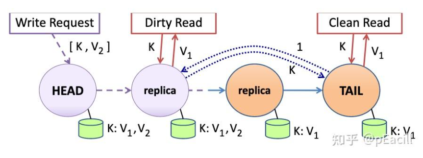 - 版本替换: 如果服务是尾部,则已提交版本被原子地替换为待处理版本,并向前驱发送确认消息。否则,写请求将被转发到后继者。当已提交版本被更新时,当前链版本作为一个字段存储在块元数据中。