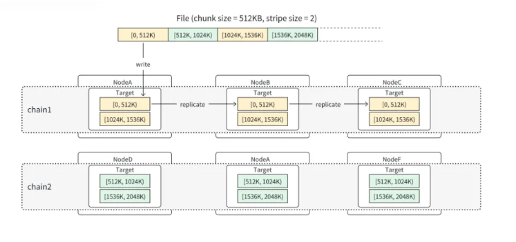 - 3FS 将文件数据划分为相等大小的 块,并将这些块 条带化 到多个 复制链 中。用户可以为每个目录指定 链表、块大小 和 条带大小。
