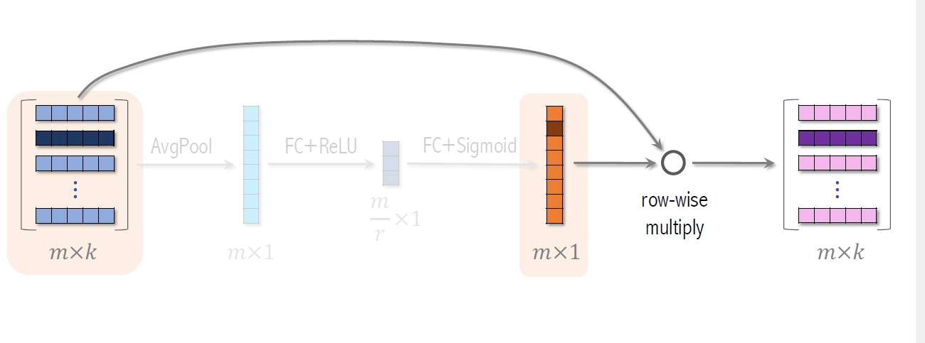 矩阵做AvgPooling得到一个 维向量 维向量过一个全连接层和Relu激活函数得到 维向量, 为压缩比例,设置成大于1的数 维向量过一个全连接层和Sigmoid函数,恢复成 维向量,值都介于0和1之间 最终的