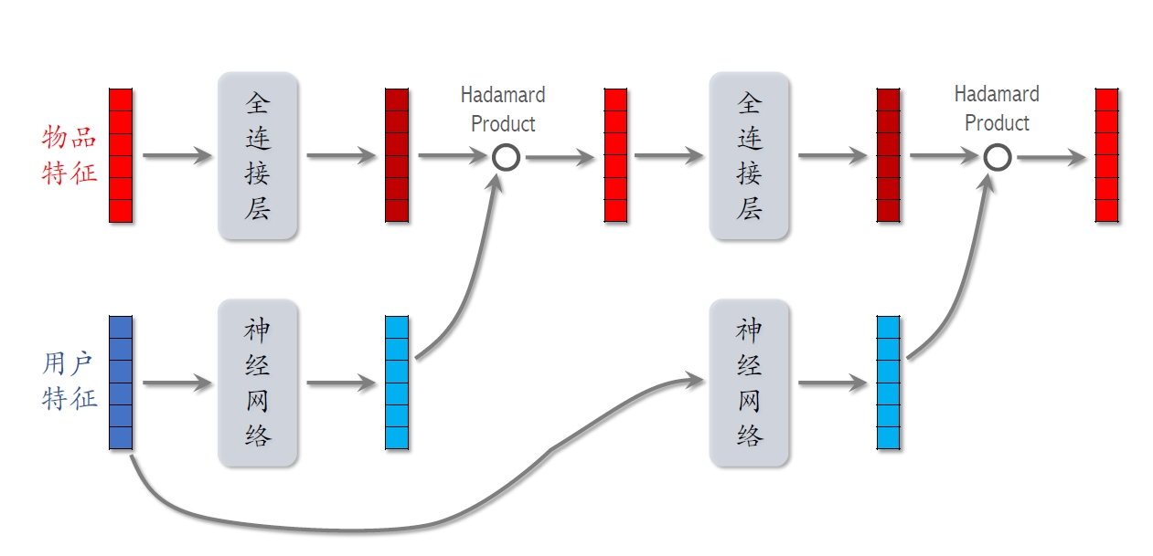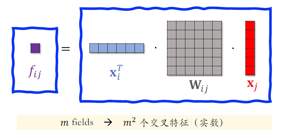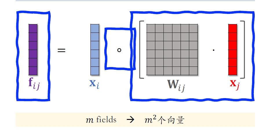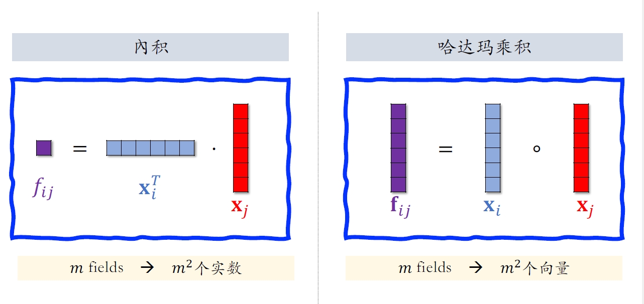 和 是两个特征的embedding,它们的形状可以相同也可以不同 - 哈达玛积方式,想要减少参数数量的话,需要人工指定某些相关的而且重要的特征做交叉,而不能让所有特征做两两交叉