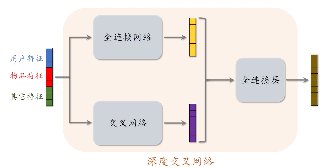 Deep & Cross Networks (DCN) 译作“深度交叉网络”,可以用于召回双塔模型、粗排三塔模型、精排模型。DCN 由一个深度网络和一个交叉网络组成,交叉网络的基本组成单元是交叉层 (Cross Layer)。