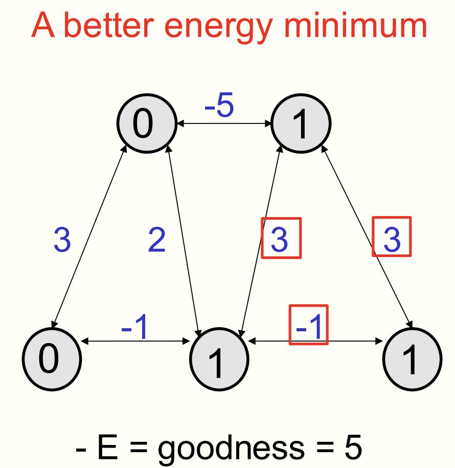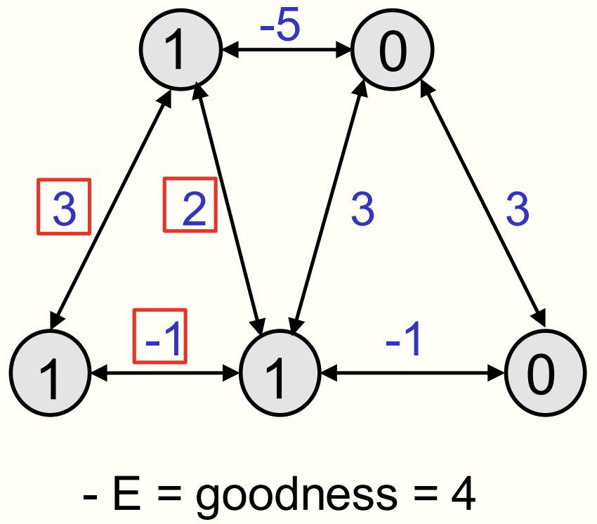 整个神经网络的全局状态,被称为一个「配置」(configuration),并有一个「优度」(goodness)。其「优度」是由所有活跃神经元之间权重的总和决定,如上图所有红色方框,权重加起来等于4。这便是该网络配置的优度,而能量(energy)是优度的负值。