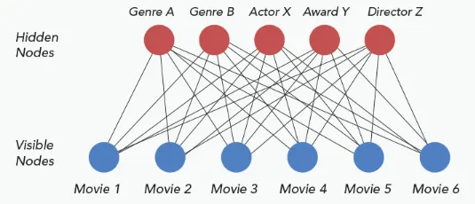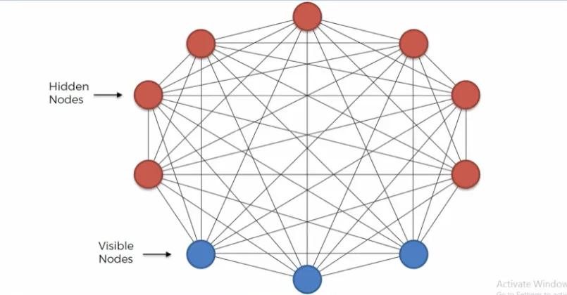受限玻尔兹曼机 (RBM): 为了避免过度拟合,我们不需要节点与同一层内的节点连接。 只有可见节点连接到隐藏节点,但输入层内的输入节点之间没有连接,隐藏层内的隐藏节点之间也没有连接。